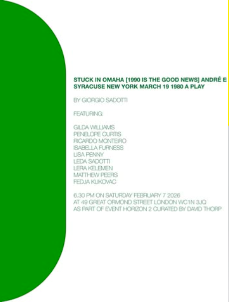 Performed in Giorgio Sadotti play ‘Stuck in Omaha. Andre Emmerich, Syracuse, NY, 1980’. Feb 2026, London, with Penelope Curtis, Ricardo Montiero, Isabella Furness, Lisa Penny, Leda Sadotti, Lera Keleman, Matthew Peers, Fedja Klikovac. Part of ‘Event Horizon 2’, curated by David Thorp.
